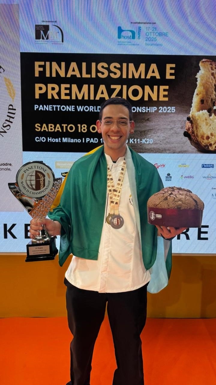 Liderado pelo padeiro cearense da Cheiro do Pão, Brunno Malheiros, o time Squadra Brasile 2025, composto também por Joze Nilson Diniz (SP), Matheus Andrade (RN) e Déborah Zanzini (SP), levantou a bandeira do Brasil neste final de semana, no encerramento da competição em equipes da “Panettone World Championship”. Disputada por representantes de 12 países, a conquista rendeu ao Brasil o título de segundo melhor Panettone de Chocolate do mundo. Ao todo, foram avaliadas por um júri técnico especializado nove categorias, com os brasileiros unindo toda a criatividade e riquezas da nossa culinária com o compromisso com a sustentabilidade.